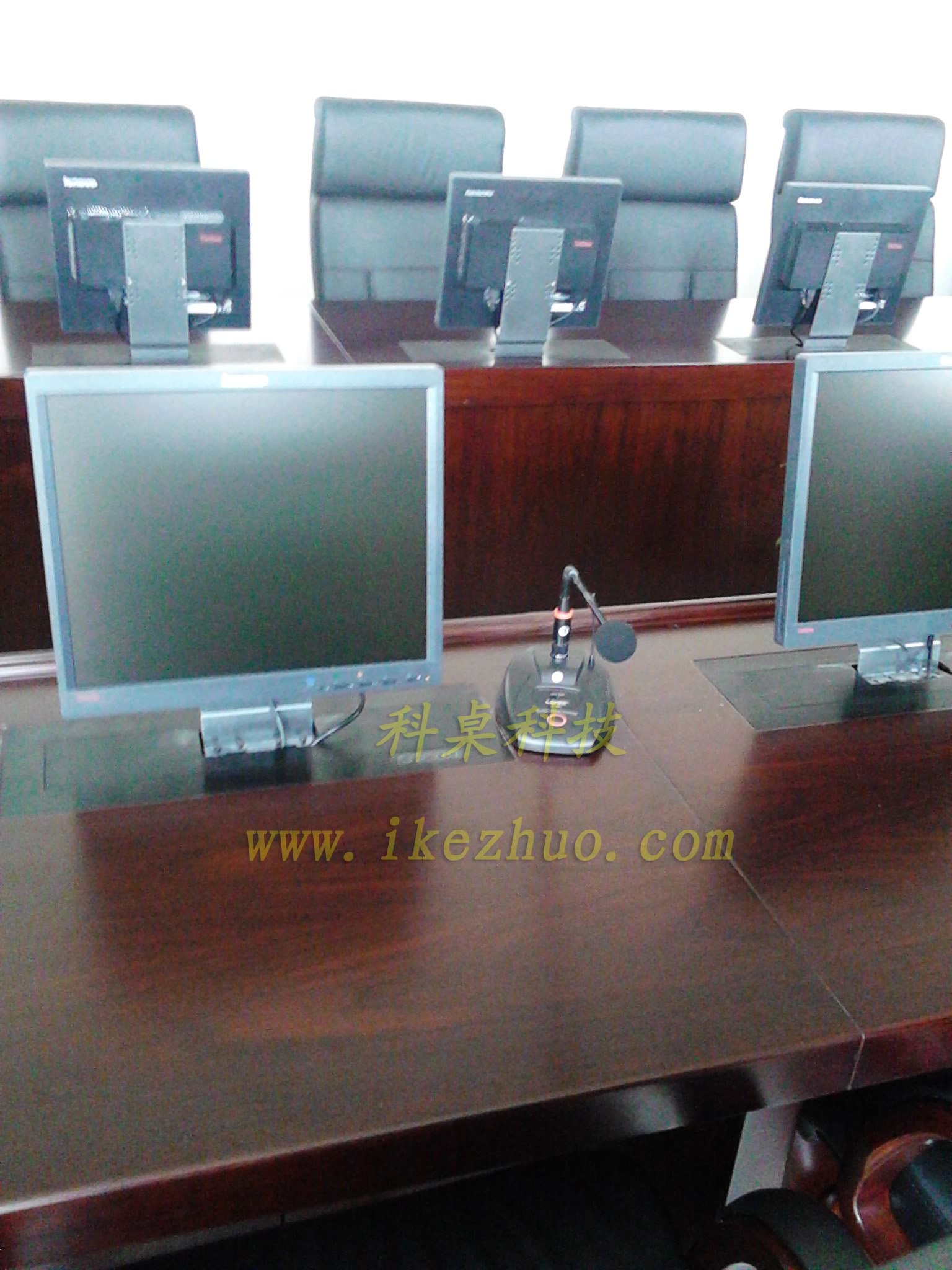 當需要舉行會議時隱藏在會議桌內的升降器把液晶顯示器從會議桌下面自動升到桌面并仰成一定角度,