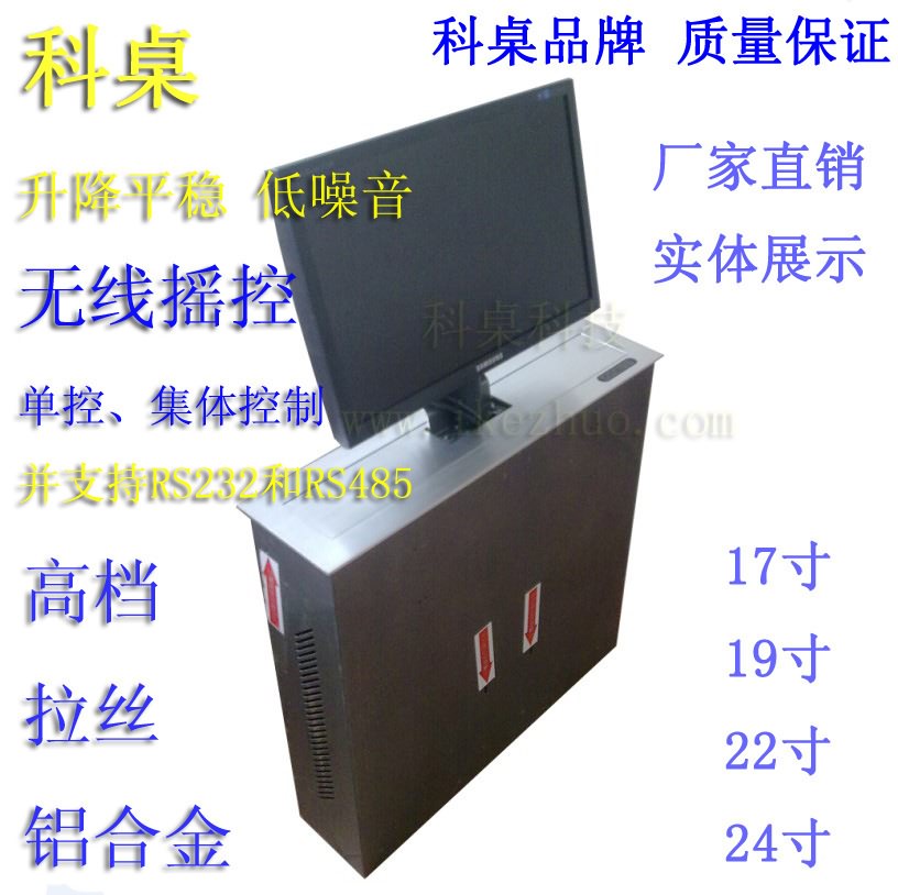 別致產品特性:該升降系統可以滿足顯示器不用拆卸及避免橫七豎八布線的需要,充分利用桌面以下的空間,把主機和顯示器同時藏于桌底下,需要時可以在需要使用時觸發控制器,倉蓋自動打開、顯示器升至桌面。顯示屏升上來后,可隨時根據視角向后調整顯示屏一定的角度便于觀看;不用時又可以收回桌底,并自動恢復顯示屏的初設角度,滿足于不同與會者的要求??梢酝ㄟ^集中控制器集體控制,也可以單屏控制。